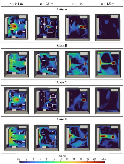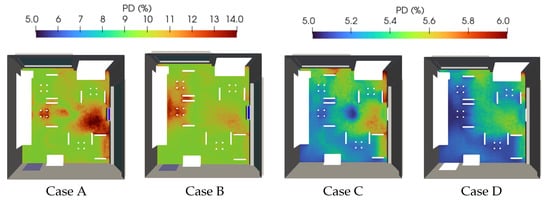 Figure 11 shows the percentage of dissatisfied distribution along the office floor obtained for the summer-cooling cases. When no solar load was considered, both inlet air velocities could guarantee a pleasant floor temperature; in the presence of the solar radiation, the floor temperature increased to some extent and lead to a higher percentage of dissatisfied. The worst result in this context was obtained for Case C, namely, minimal inlet velocity with a solar radiation load.