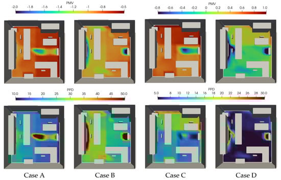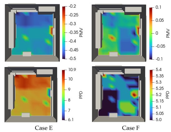 Figure 16 shows the and associated distribution in the office during winter-heating conditions. Both cases (minimal and maximal inlet air velocities) ensured a pleasant experience for the occupants, with values that ranged from −0.5 to 0.1. In particular, Case F had the best environmental condition for thermal comfort, with values close to 0 all over the office. For both cases, a slight cold sensation was felt near the windows, especially the one on the northeastern direction; so, it was reasonable to move the working stations, so that they were not too close to them.