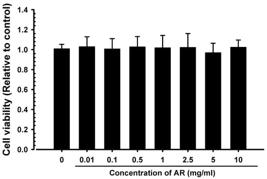 When examining the results of the MTT cytotoxicity evaluation on splenocytes collected and cultured from the normal vehicle control group at the time of euthanasia, no significant changes were observed in cell viability for all AR-treated groups (0.01–10 mg/mL) compared to the untreated control group (0 mg/mL; Figure 2).