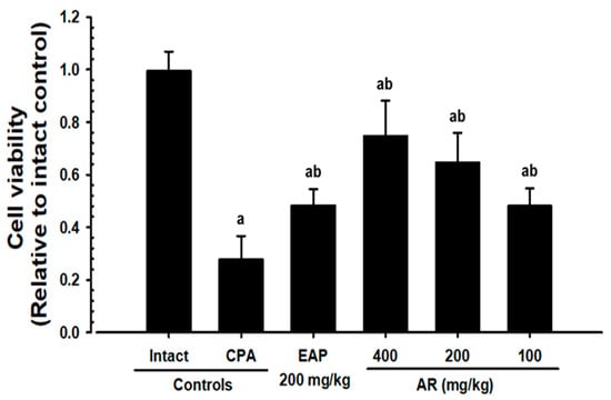 CPA is an immunosuppressive agent that typically inhibits the hematopoietic system, accompanied by a decrease in the number of leukocytes and platelets in the blood, as well as a decrease in HGB and HCT, such as in aplastic anemia [11,16,30,51]. Based on the 13 hematological test results in this study, significant reductions were observed in the total leukocyte and RBC count, HGB, HCT, and platelet count of the CPA control group compared to those in the control group. Moreover, as a result of panleukopenia, no change was observed in the leukocyte differential count in this experiment. In contrast, the decrease in total leukocyte and RBC count, HGB, HCT, and platelet count due to hematopoietic inhibition by CPA administration was significantly suppressed in a dose-dependent manner by the oral administration of AR (100, 200, and 400 mg/kg). In particular, AR at a dose of 100 mg/kg showed a reduction in the inhibition of the hematopoietic system, comparable to that of 200 mg/kg of EAP. These results suggest that oral administration of AR (100, 200, and 400 mg/kg), at least under the hematological examination conditions of this study, inhibits CPA-induced panleukopenia, thrombocytopenia, and aplastic anemia in a dose-dependent manner. This is regarded as reliable evidence, showing an inhibitory effect at a 100 mg/kg oral dose of AR as compared to EAP (200 mg/kg).