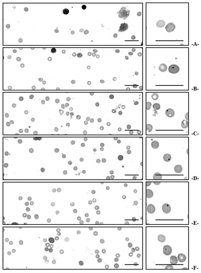 Representative cell smear cytological images of the bone marrow cells collected from individual mice in each group upon euthanasia. (A) Intact vehicle control: distilled-water administered intact mice; (B) CPA control: cyclophosphamide-treated and distilled-water administered control mice; (C) EAP200: CPA treated and A. pullulans purified exopolymers (EAP at a dose of 200 mg/kg) administered mice; (D) AR400: CPA treated and AR (400 mg/kg) administered mice; (E) AR200: CPA treated and AR (200 mg/kg) administered mice; (F) AR100: CPA treated and AR (100 mg/kg) administered mice; AR = Astragali Radix (Roots of A. membranaceus Bunge) extracts; PCE = Polychromatic erythrocytes; MN = Micronucleus; NCE = Normochromatic erythrocytes; MNPCE = MN contained PCE; all May-Grunwald and Giemsa stain; scale bar = 20 µm.