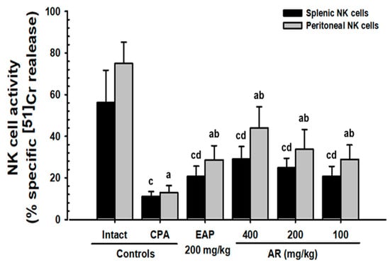 As part of the immunosuppression by CPA, the function of immune-responsive cells, such as NK cells and macrophages, is significantly suppressed, and the activity of these immune-responsive cells is currently in the limelight as another concept of immune modulator development [58,59]. In the present study, significant reductions in peritoneal and splenic NK cell activity were confirmed in the CPA control group compared to the normal vehicle control group. However, in the AR (100, 200, and 400 mg/kg) groups, a significant increase in peritoneal and splenic NK cell activity was observed in a dose-dependent manner compared to the CPA control group. In particular, 100 mg/kg oral dose of AR showed an inhibitory effect on the reduction in CPA-induced NK cell activity comparable to that of 200 mg/kg of EAP. These results provide clear evidence that, at least under the conditions of this experiment, oral administration of AR (100, 200, and 400 mg/kg) significantly suppresses the decrease in NK cell activity by CPA in a dose-dependent manner, which is comparable to that of EAP (200 mg/kg) in 100 mg/kg oral dose of AR.