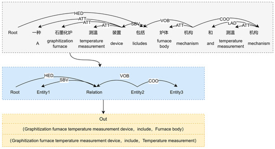 To learn effective extraction patterns, the entity relation dependency paths of the triad and related sentences were first labeled on the results of the dependency syntactic analysis, with the specific entities labeled as “Entity” and the relation labeled as “Relation”. Then, the content of the dependency path is replaced with the label to create the triadic relation pattern, thus annotating the entire sentence with the relation, as shown in Figure 4 (The figure shows the results of the Chinese specific process).