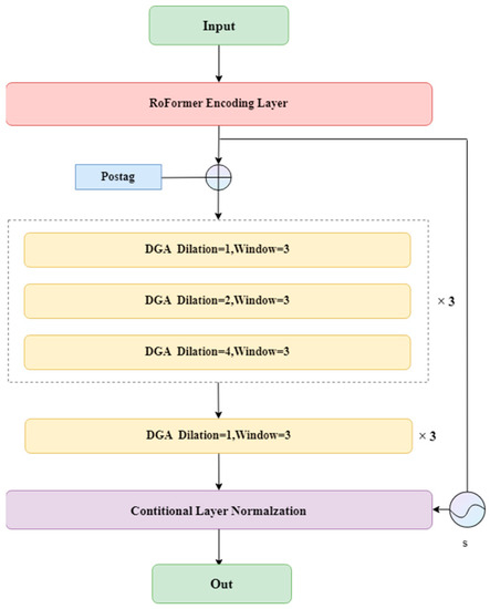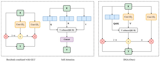 The DGANet proposed in this paper consists of 12 layers of dilate gated attention (DGA), each of which includes a one-dimensional inflated convolution and a gated attention unit (GAU) [40] fused with a residual structure. The structure is shown in Figure 6.