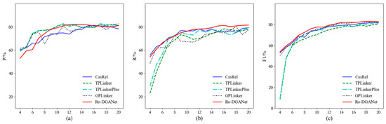 The results of the evaluation metrics of the different models on the LIC2019 dataset as the number of training increases are shown in Figure 7. Figure 7 shows that TPLinker and TPLinkerPlus have a slower convergence rate of recall and F1 value due to their more complex models. In contrast, GPLinker and CasRel have a faster convergence recall number and F1 values during the training process; the change in F1 value floats less after convergence. The proposed model is comparable to CasRel and GPLinker in terms of the F1 value convergence speed on the LIC2019 dataset. However, the recall index was higher than the other models, and the variation was more stable after convergence. Meanwhile, the accuracy rate of this model fluctuated less than that of other models during the training process and was stable. In summary, the Ro-DGANet model extracts the best effect and converges faster, indicating that the introduction of the expansion gate attention network module can obtain more effective attention information.