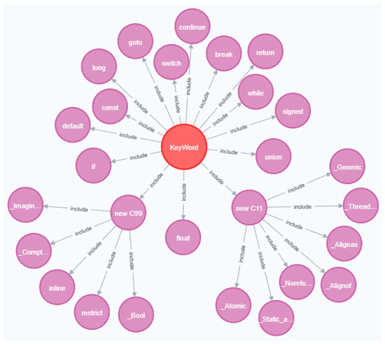 The accuracy P, recall R, and F1 values were improved compared with the baseline model without adding any function module, where F1 improved by 3.15% on the IDATA dataset and the recall rate improved by 3.17% on the CDATA dataset. This showed that the performance of the Ro-DGANet model improved not only on the IDATA dataset composed of short texts but also on medium and long texts. It was also effective on the CDATA datasets, consisting of medium and long texts. Taking C language as an example, the core knowledge graph of the programming language is constructed as shown in Figure 9. The accuracy of Ro-DGANet ranged from 82% to 86% in the industrial and C programming domains, which can be used as a reference for constructing domain knowledge graphs in the future.