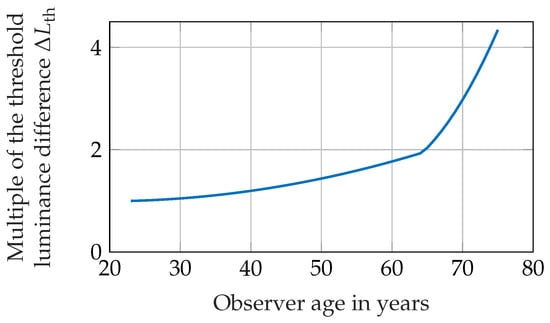 Age influence on the threshold luminance difference according to Blackwell and Blackwell [33]; the observer’s age has a significant influence on the required threshold luminance difference ; especially from an age of 64 years, the age influence increases significantly [33].