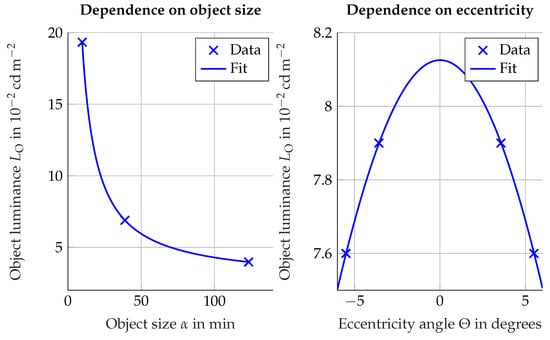 Dependence of the required object luminance on the object size (left) and the eccentricity angle (right) according to Damasky [18]; both with increasing object size and with increasing eccentricity angle the object luminance required for detection decreases; for both fit functions, the coefficient of determination is greater than 0.99 [18].