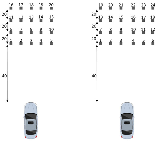 The distances to the object rows of the measurement grids were 40 , 60 , 80 , and 100 for both studies. Due to the limitation of the light tunnel, as shown in Figure 5 on the left, a measurement grid was feasible, with which a total of 20 object positions were investigated during the detection study. At the closed test site, a total of 24 object positions were considered in a measurement grid (see Figure 5 on the right). Table 1 and Table 2 show the exact positions of the gray cards in front of the test vehicle in the respective measuring grids. Here, negative horizontal distances represent an offset to the left with respect to the longitudinal axis of the vehicle and positive horizontal distances represent an offset to the right with respect to the longitudinal axis of the vehicle.
