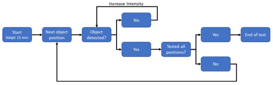 The study session started with an adaptation phase of about 15 , during which the drivers received the instructions for the experimental procedure. Subsequently, the gray card was placed on the first randomly chosen position. The headlamp light intensity was increased in discrete PWM levels from 0% to 100% (8-bit values: 0 to 255), and the driver was tasked with signaling the detection of the gray card by pressing a button while fixating a second vehicle positioned behind the last row of objects in the driving direction. Gaze fixation was required to ensure that the angle between the observer and the detection object was reproducible for all drivers. After all PWM levels were completed at the current object position, the next object position was selected in a randomized order. When changing object positions, the driver was asked to close the eyes so that the next object position remained unknown at first. This procedure was repeated until the study was completed on all object positions. The study procedure was identical for the light tunnel and the closed test site. Figure 6 shows a schematic diagram of the test sequence for illustration purposes.