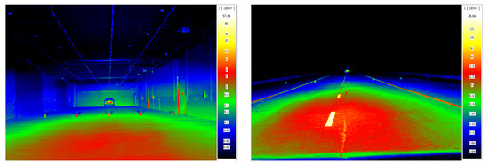 Exemplary representation of the recorded luminance images for the light tunnel (left) and the closed test site (right); the fixation vehicle, which is positioned behind the last row of objects in the driving direction, can be observed in both figures.