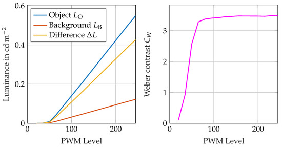 As Equation (6) shows, the course of the luminance difference can be described as a multiple a of the set PWM level. This is also the case for the background luminance , which is linked to the set PWM level via the constant slope b. Thus, in the linear range of the luminance curve, a constant Weber contrast results, which can be represented as the ratio of the two slopes, a and b.