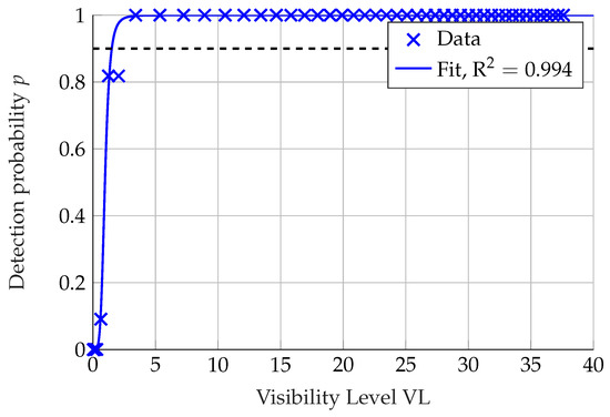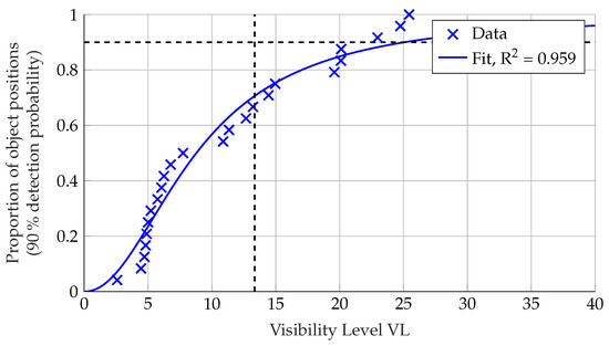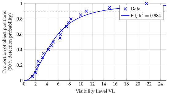 This procedure yields the Visibility Level as an independent variable and the proportion of object positions as a dependent variable. To test these two variables for correlation, again, the simplified psychometric function of Linschoten et al. [43] is used (Equation (5)). The result of this analysis is shown in Figure 12 and indicates, with a coefficient of the determination of 0.984, that there is a correlation between the Visibility Level and the proportion of object positions with a detection probability of the gray card of at least 90%.