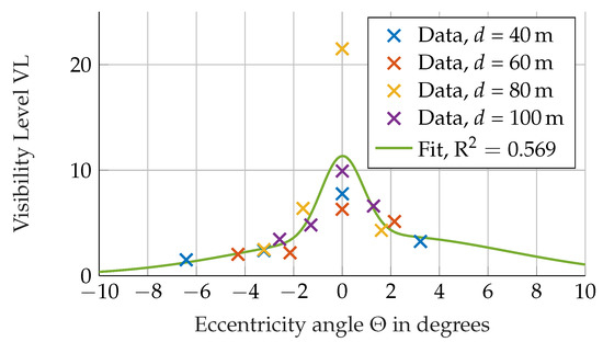 The angle dependence of the Visibility Level is determined after removing these data points. For this purpose, the eccentricity angles to the respective measurement grid points are determined, and the data for the different distances are summarized. The summarization of the data is made possible by the fact that the distance is already taken into account in the calculation of the threshold luminance difference with the STV model and the object size required for this purpose (see Equation (7)).
