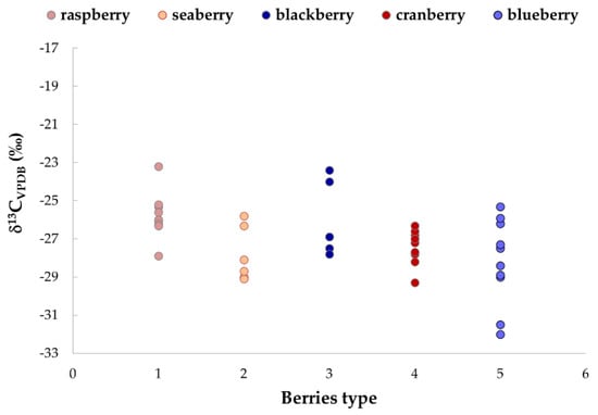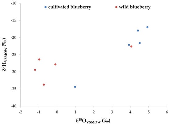 - Perini, M.; Giongo, L.; Grisenti, M.; Bontempo, L.; Camin, F. Stable Isotope Ratio Analysis of Different European Raspberries, Blackberries, Blueberries, Currants and Strawberries. Food Chem. 2018, 239, 48–55. [Google Scholar] [CrossRef] [PubMed]