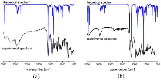 The IR spectrum of LSD has been calculated during the optimization process. The vibrational spectrum can be visualized by the GaussView [22] program and further analyzed in the VEDA software [23]. As LSD is a low-symmetry molecule, all vibrations are active in the IR spectrum (141 normal modes). When the highly symmetric molecule is analyzed, it is beneficial to obtain both IR and Raman spectra because of the exclusion principle. In our case, the calculated wavenumbers were overestimated, and the scaling factor was calculated by comparing experimental and theoretical wavenumbers. The scaling factor can be obtained as the ratio between the observed and calculated wavenumbers of the same vibration, most commonly C=O vibration. The band belonging to this vibration in the experimental spectrum is positioned at 1625 nm, while in the theoretical spectrum, it is at 1747 cm−1 (Figure 2). The scaling factor calculated based on these values is 0.930. The experimental, scaled, and unscaled theoretical values are presented in Table S3. Theoretical values are shown only in the observed range (3500 to 500 cm−1). Figure 2 shows the experimental and scaled IR spectrum of LSD base and LSD tartrate.