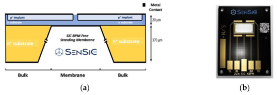 Moreover, the SenSiC company is able to produce the so-called “free-standing membrane” by removing the 370 µm n+ thick substrate using doping selective electrochemical etching as shown in Figure 1a [21,22]. A picture of a developed SiC sensor mounted on a PCB is also shown in Figure 1b.