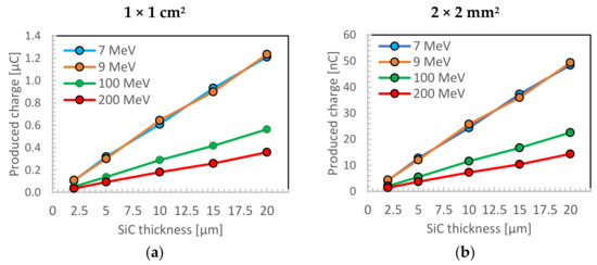 As an example, Figure 2a,b shows the results obtained with the simulations of SiC sensors having a thickness of 2 µm, 5 µm, 10 µm, 15 µm and 20 µm. The energy deposited by 7 MeV, 9 MeV, 100 MeV and 200 MeV electrons in the SiC sensor has been recorded in the simulations to finally calculate the produced charge within the sensor. To have a good compromise between low statistical uncertainties and reasonable computation time, 1 M histories were simulated. To reproduce a realistic case of a dose-to-water deposition of, for instance, 2 Gy, a normalization factor for the total number of histories was retrieved, considering the ratio between the dose deposited for 1 M histories and 2 Gy. This normalization factor is then multiplied for each single energy deposition event for the several configurations of sensor thickness and area used. Afterwards, the total deposited energy for each single configuration was converted to produce a charge through the electron-hole pair production energy, considering their ratio.