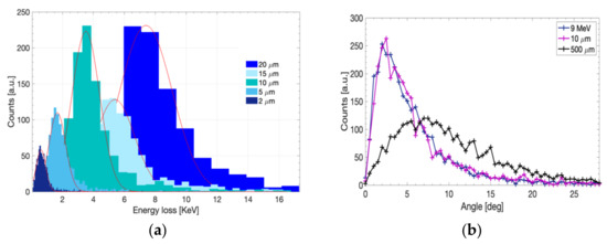 As an example, Figure 3a reports the simulated distributions of the energy deposited in the 2 µm, 5 µm, 10 µm, 15 µm and 20 µm active thicknesses in the case of 9 MeV mono-energetic beam impinging on the detector surface in vacuum. As expected, the widely obtained energy loss distributions have been fitted using a Gaussian function, as shown in Figure 3a. The resulted values for the centroids and the FWHM are, respectively, 0.62, 1.67, 3.51, 5.4 and 7.4 KeV and 0.73, 1.27, 2.11, 2.97 and 4.00 KeV for the 2 µm, 5 µm, 10 µm, 15 µm and 20 µm active thicknesses.