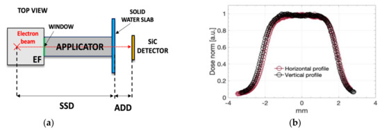 The dose transversal profile at the SiC position was also measured with RCF-EBT3 type for each applicator configuration to verify the dose uniformity over the SiC active area (maximum 1 × 1 cm2). Figure 4b shows, as an example, the dose profiles (vertical and horizontal) measured at the SiC position with one of the used applicators, in this case the 40 mm one. As is clearly shown, a flat region of about 15 mm (within 98% percentage dose) and a lateral penumbra (20–80%) of about 7 mm are measured. As the SiC detector has a 1 × 1 cm2 active area, flat profiles over a 15 mm length guarantee a constant dose delivered within the whole SiC active area of 1 × 1 cm2.