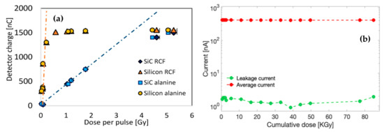 (a) SiC response measured with the Keithley 6517A electrometer as a function of the dose per pulse measured with the RCF and the alanine detectors placed in the same location of the detectors. Cross comparison with a commercially available Silicon diode from PTW is also shown. (b) Leakage current of the SiC detectors after each irradiation and average current detected as a function of the cumulative dose delivered at the SiC position.