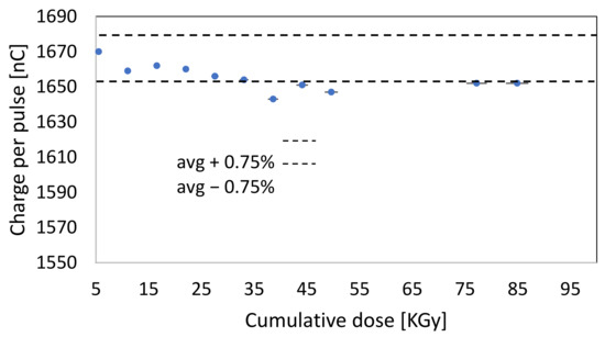 Besides this study of linearity response at high dose rates, a characterization of the detector radiation hardness was performed to evaluate the leakage current as a function of the accumulated total delivered dose up to 90 KGy, using the 35 mm applicator. Figure 5b shows the leakage current measured after each measurement that was performed using the maximum dose per pulse achievable, i.e., 5 Gy/pulse, and accumulating a total number of 400 pulses at 5 Hz. As can be seen in Figure 5b, no degradation of the sensor, specifically of the signal-to-noise ratio, is observed up to 90 kGy. Additionally, the charge per pulse after each irradiation as a function of the cumulative dose was also measured, as is shown in Figure 6. This study was required to evaluate the radiation hardness of the SiC and, in particular, its response stability after a large amount of accumulated dose. Results in Figure 6 show a variability of the charge per pulse measured with the SiC within the ±0.75% for the explored accumulated dose, which clearly demonstrates the reliability and stability of the SiC performances.