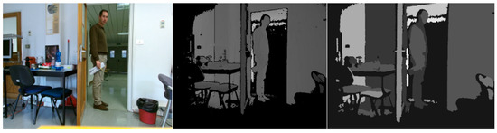 Raw color image (left), depth map (middle), and segmentation map (right).