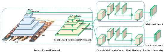 RetinaFace is based on three main modules made by a feature pyramid network, the context head module, and the cascade multi-task loss. The first module is composed of a pyramid network that digests the input images by computing five different feature maps, each one at a different scale. These are then used by the context head modules to compute, for each of the feature maps, the multi-task loss described below. The first context head module makes a first bounding box for the anchor, which is fine-tuned by the second context head module to generate a more accurate bounding box.