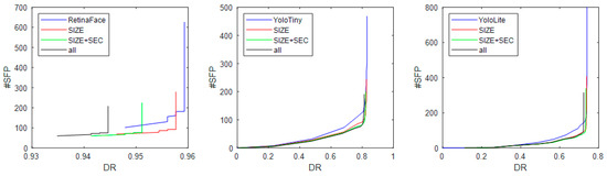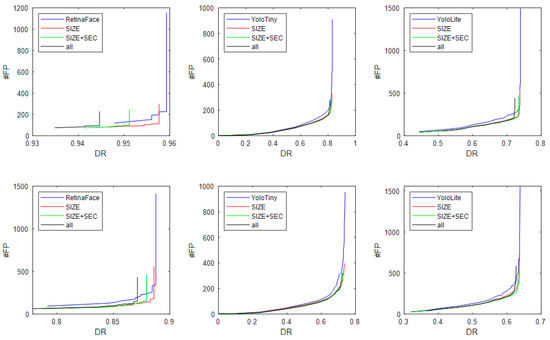 According to the plots in Figure 7 it is clear that the best trade-off between the detection rate and the number of false positives is gained by coupling the face detector with the filtering method named “size”. It happens for all the approaches tested in this paper, but undoubtedly this is more interesting for YOLO since the performance is lower.