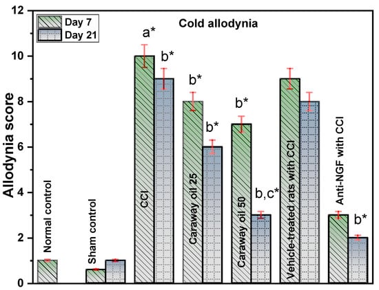 Evaluation of the effect of caraway oil on CCI-induced paw cold allodynia using the acetone sprinkling test. It is represented as mean ± SEM; n = 6. a p ≤ 0.05 against sham control correspondent to the same day. b p ≤ 0.05 against CCI comparable to the same day. c p ≤ 0.05 versus caraway oil and anti-NGF in CCI compatible to the same day. * represents p-value ≤ 0.05.