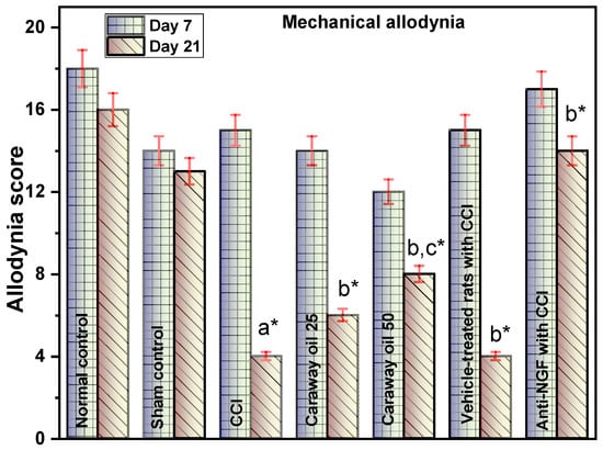 Effect of caraway oil on CCI-induced mechanical hyperalgesia assessed by pinprick test. Values are given as mean ± SEM, n = 6. a p ≤ 0.05 versus sham control corresponding to same day. b p ≤ 0.05 versus CCI corresponding to same day. c p ≤ 0.05 versus Caraway oil and anti-NGF in CCI corresponding to same day. * represents p-value ≤ 0.05.