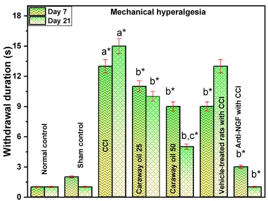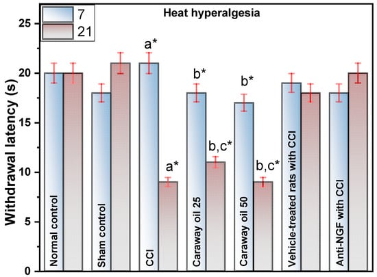 Effect of Caraway oil on CCI-induced heat hyperalgesia assessed by Eddy’s hot plate test. It is represented as mean ± SEM; n = 6. a p ≤ 0.05 against sham control correspondent to same day. b p ≤ 0.05 against CCI comparable to same day. c p ≤ 0.05 versus caraway oil and anti-NGF in CCI compatible to same day. * represents p-value ≤ 0.05.