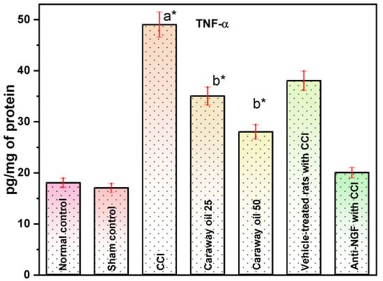 The study findings showed that increased TNF-α levels in the sciatic nerve were related to the neuropathic pain produced by CCI. TNF-α is the prototypical example of a pro-inflammatory mediator because of its location at the beginning of the cytokine cascade. It is widely recognized that TNF-α plays a role in neuropathic pain by making nerves in the peripheral and central nervous systems more sensitive. This fact has been demonstrated by an extensive research []. The findings of this study, which demonstrate higher levels of TNF-α in the sciatic nerve on day 21 in rats that had been treated with CCI, align with the findings of other investigations []. The decrease in TNF-α levels could have been caused by suppression of substance P, nerve growth factor, or cytokines. Several studies have shown that cytokines involved in inflammation, such as IL-1β, TNF-α, and IL-6, are promoters of NGF synthesis in different cells []. Caraway oil has a significant impact on suppressing neuropathic pain in rats. This is likely because it mediates a decrease in cytokine production, especially of TNF-α. Carvone (a significant constituent of caraway oil) decrease the biosynthesis of leukotrienes, prostaglandins, and inflammatory cytokines (IL-1, TNF-α) [].