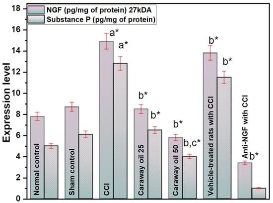 The effect of caraway oil on nerve growth factor and substance P in patients with CCI-induced neuropathy. It is represented as mean ± SEM; n = 6. a p ≤ 0.05 against sham control correspondent to same day. b p ≤ 0.05 against CCI comparable to same day. c p ≤ 0.05 versus caraway oil and anti-NGF in CCI compatible to same day. * represents p-value ≤ 0.05.
