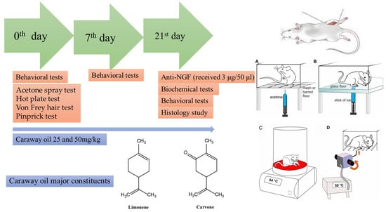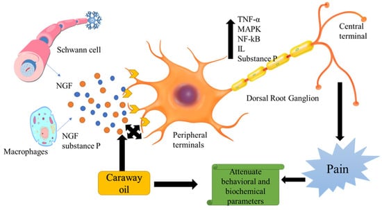 In recent years, there has been a growing belief that medicinal plants are a safer treatment option over synthetic drugs. This change has led to the increasing use of phytopharmaceuticals []. Caraway (Carum carvi L.) belongs to the umbellifers family and is native to Europe, Asia, and North Africa. Seeds are used as spices in foods due to their pleasant taste []. Caraway essential oil has antioxidant [], digestive and IBS-preventative [], antidiabetic [], antihyperlipidemic, weight-lowering [], anticancer [,], antimicrobial [,,] and anti-inflammatory [,,] potential. Caraway oil is available in various marketed formulations with anti-inflammatory, antibacterial, and other effects, alone or in combination with others [,,]. The knowledge gained from this literature can then be used to verify the presumed medicinal effects of caraway oil. However, the anti-neuropathic effect of caraway oil on chronic constriction injury (CCI) has not been investigated. Therefore, the present study was designed to explore the effect of caraway oil on CCI-induced neuropathic pain in rats and to establish the relationship between the inhibition of NGF and the substance P in the observed effect. The summary of the work is presented as graphical Scheme 1.