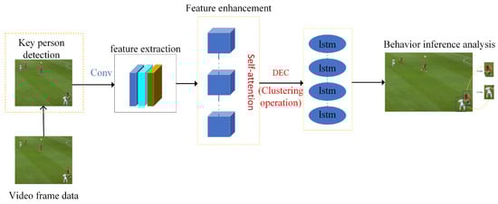 Overall flow chart of algorithm. First, input the video frame data to locate and detect the key people, and then extract the features through convolution. Secondly, incorporate the self attention mechanism here to enhance the features, and then cluster through DEC. Finally, conduct behavior analysis and inference through LSTM.