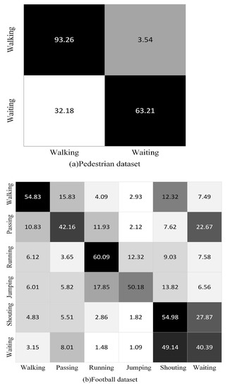 Table 2 shows the results of the comparison. Obviously, this method is superior to other networks listed, which shows that our framework is feasible and can improve performance. The combination of the two further improves accuracy. This shows that DEC and the self-attention mechanism play a key role. At the same time, our results are better than the traditional deep learning model. It can be seen that important people and body parts received more attention. We also express the following confusion matrix, where walking and waiting are almost 100% recognized. On the other hand, jogging and walking are difficult to be clearly defined, which will lead to less-than-expected recognition results because they have similar visual properties.