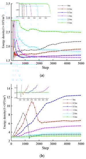 Stress balancing was performed before the excavation, and all units’ strain energy densities were recorded at every iterative step using a customized variable. The variation process of the energy density of the maximum and minimum principal stress direction depths of 0 m, 0.2 m, 0.5 m, 1 m, 2 m, and 5 m with the simulation process is shown in Figure 5. It can be seen from the figure that stress release occurred in the unit in the direction of maximum principal stress at the moment of excavation due to the change in the stress state. Although some of the energy was restored during the subsequent stress adjustment, the final value was still less than the initial value. The energy release of the unit in the direction of the maximum principal stress occurred earlier, when the step was about 500, the energy release began at the measuring point buried 5 m, and the earlier the energy release occurred, the shallower the measuring point was buried. It can be seen that the change in stress state caused by the excavation induced the release of energy in the direction of minimum principal stress due to the unloading wave transmitted from the excavation to the depth of rock mass. The energy disturbance caused by the transient stress state change caused by the excavation of the unit in the direction of minimum principal stress could be neglected, and the whole process lasted less than 100 steps. Then, the energy rapidly accumulated during the stress redistribution process, with unit energy near the excavation boundary accumulating faster. When the strain energy accumulated to a certain extent, the unit was destroyed, and a portion of the strain energy was released.