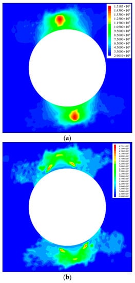 The local energy release effectiveness (shown in Figure 8) could be calculated with the maximum energy density before and after the energy release, as well as their occurrence time. Taking one-tenth of the maximum value as the lower limit of the contour plot, it can be observed that the distribution of local energy release effectiveness aligned with the actual location of the rockburst well. The maximum radius was between 2.20 and 2.257 m, which was approximately 1.26–1.29 times the radius of the excavation zone, which closely matches the actual radius of 1.3 times.