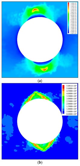 The maximum energy density before the energy release and the energy density after the energy release, as well as their occurrence time, are shown in Figure 6 and Figure 7. It is apparent that there was significant energy accumulation in the direction of the minimum principal stress, and the peak energy occurred earlier on the excavation surface than in the rock mass. The distribution pattern of the energy density after release was similar to the maximum density, except that the low energy area appeared near the excavation surface.
