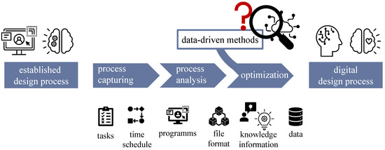 - Gerschütz, B.; Spießl, B.V.M.; Schleich, B.; Wartzack, S. An Adapted Method for Design Process Capturing to Meet the Challenges of Digital Product Development. In Proceedings of the International Conference on Engineering Design (ICED21), Gothenburg, Sweden, 16–19 August 2021; Volume 1, pp. 365–374. [Google Scholar] [CrossRef]