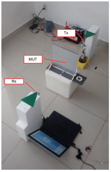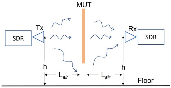 The transmission measurement configuration, where the transmitting and receiving antennae are placed one in front of the other at a fixed distance and the material under test (MUT) is placed between the antennas, is considered (see Figure 1). It is worth underlining that the transmission-only configuration is dictated by the unidirectional nature of the radios in use, which exploits the so-called simplex configuration, where one radio only transmits and the other only receives.