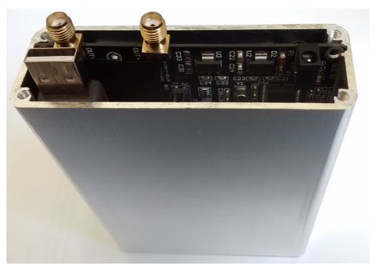 Detail of the transmitter board inside the aluminum case. The USB connector (universal serial bus), used for receiving configurations from the computer, and two RF SMA connectors [] (only one was used and the other was turned off during the tests) are shown. The power connector is on the right.