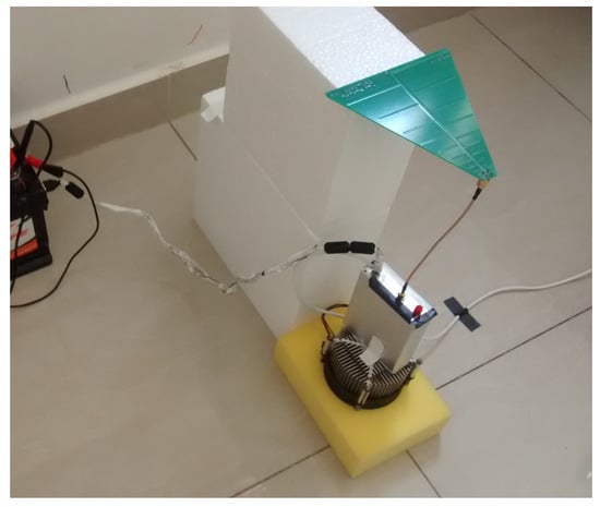 In order to have more compactness and mechanical stability, and to avoid delay and loss in the received signal due to cables, the receiving antenna was directly connected to the Rx SDR, using only an adapter to match the gender of the connectors, as shown in Figure 5.