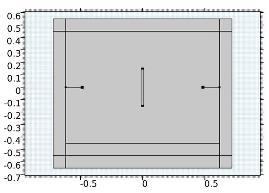 In order to simplify the computational model, a two-dimensional (2D) geometry was adopted, where the scene was assumed to be constant along the direction parallel to the floor and to the MUT sheet. The domain of the problem, as shown in Figure 6, was bounded by perfect matched layers (PMLs) [], simulating an open environment. The antennae and center of the MUT were at m above the floor. However, as this distance was not quite far enough, a multipath propagation should be considered. To this end, we incorporated a 10 cm layer at the bottom of the geometry, in which the complex permittivity of the building material of the floor, i.e., concrete, could be set to approximate the overall effect. A study regarding the adopted values is described in the next section.