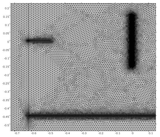 A physics-controlled mesh was used, with a wavelength as the maximum element size. Special refinement was performed where the fields were more subject to variation due to the small parts of the geometry or interfaces between materials (see Figure 7), resulting in triangular elements. The normalized quality of these elements was (minimum) and (average), on a scale where the maximum value of 1 means a perfect equilateral triangle, that is, fewer errors in the FEM.