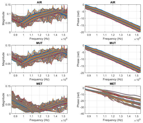 Simulated complex signals for the three configurations, when changing the variable complex of the floor and the probes in a total of 336 curves. Magnitudes are on the left and phases are on the right. From top to bottom we have AIR, MUT and MET. Due to the number of curves, the phase is unwrapped [,] for clarity, and the parameter is kept constant, equal to 0.1.