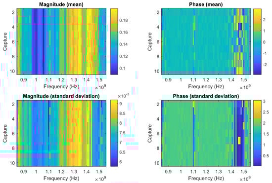The mean (top) and standard deviation (bottom) of the frames in the captures of the configuration AIR, both for magnitude (left) and phase (right). The first capture was omitted because it was always corrupted by errors at the start of the measurement.