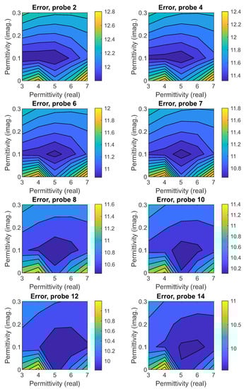 Average error between simulated and measured data, considering AIR and MUT, for different scenarios in which the complex permittivity of the floor and probe were changed. In this case, all the samples were used and the error was not normalized. For brevity, we reported only the even probes (2, 4, 8, 10, 12 and 14) and probe 7, to have an even number of subfigures.