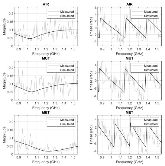 Measured and simulated complex signals for the three configurations, using the optimized values of Table 1. Magnitudes are on the left and phases are on the right. The configurations from top to bottom are AIR, MUT and MET.